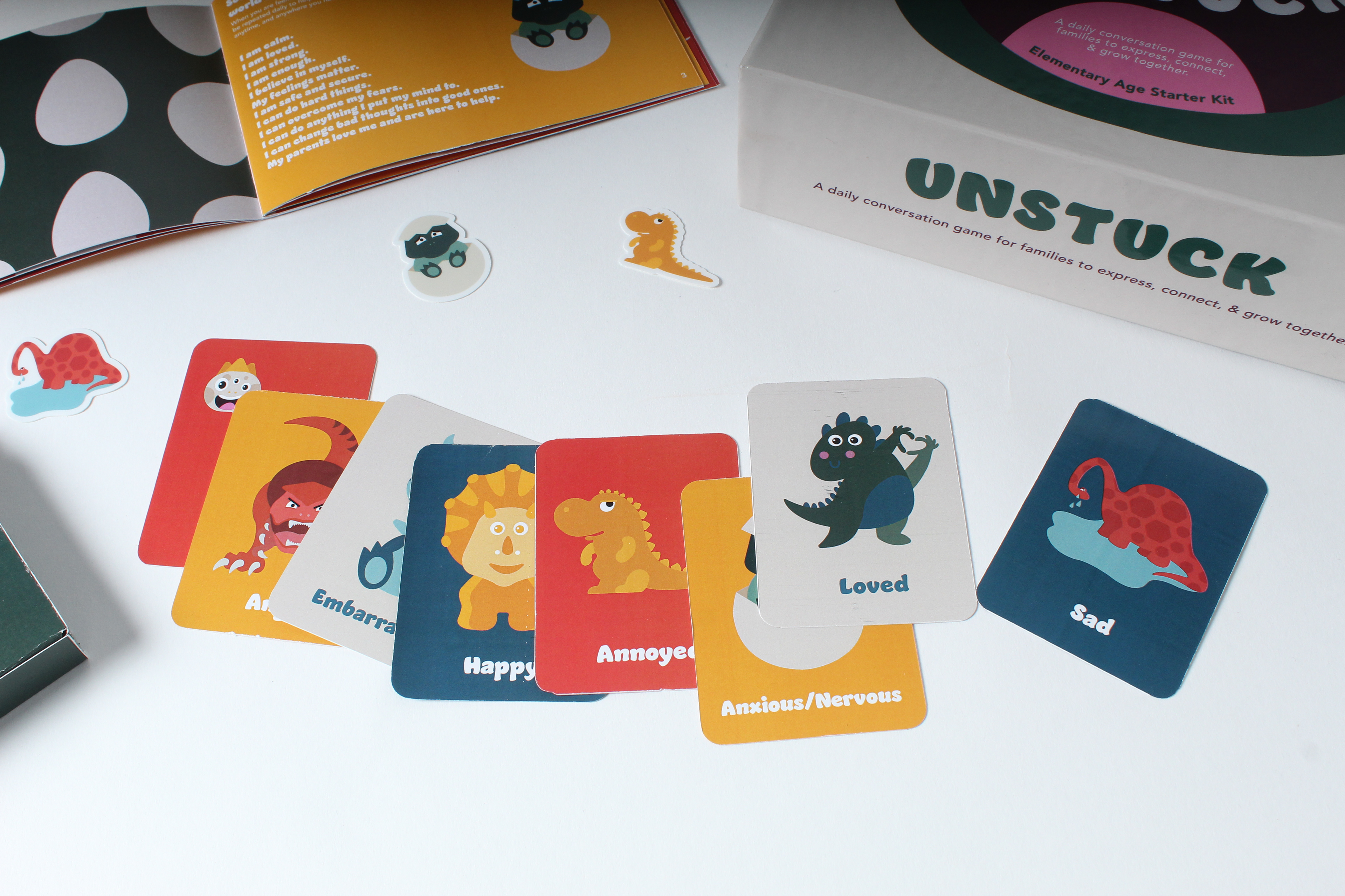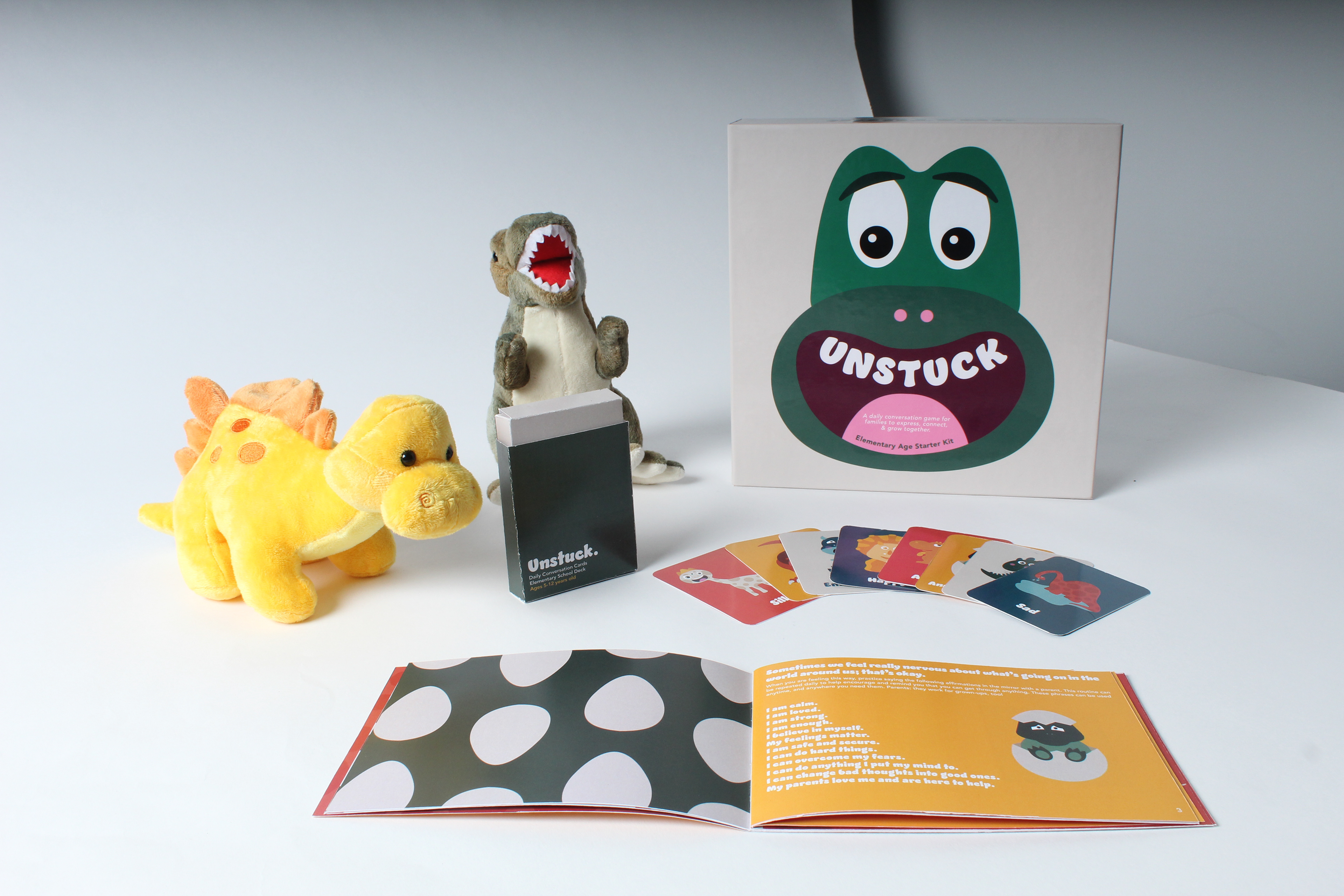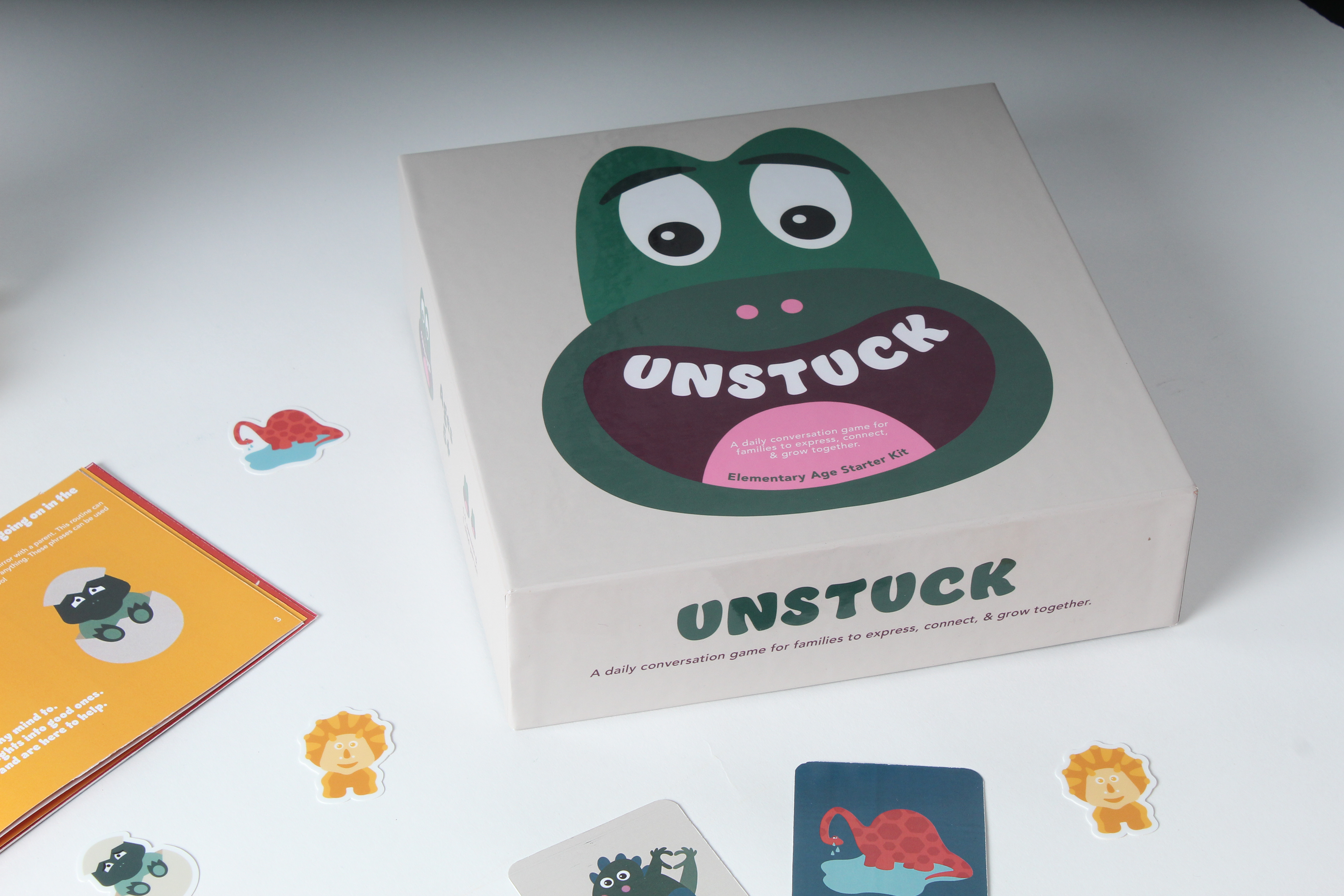 Unstuck is a daily conversation game created for families to express, connect, and grow together. The goal of Unstuck is to provide a safe space for children to share their emotions, discuss them constructively, and create positive coping mechanisms with their parents. This products aims to bridge the gap between parents and their children. Each emotion is paired with a dinosaur to help create a more inviting environment for children to talk about their feelings. This product comes with a parent guide, conversation cards, a children's workbook, stickers, and a choice of stuffed animal.